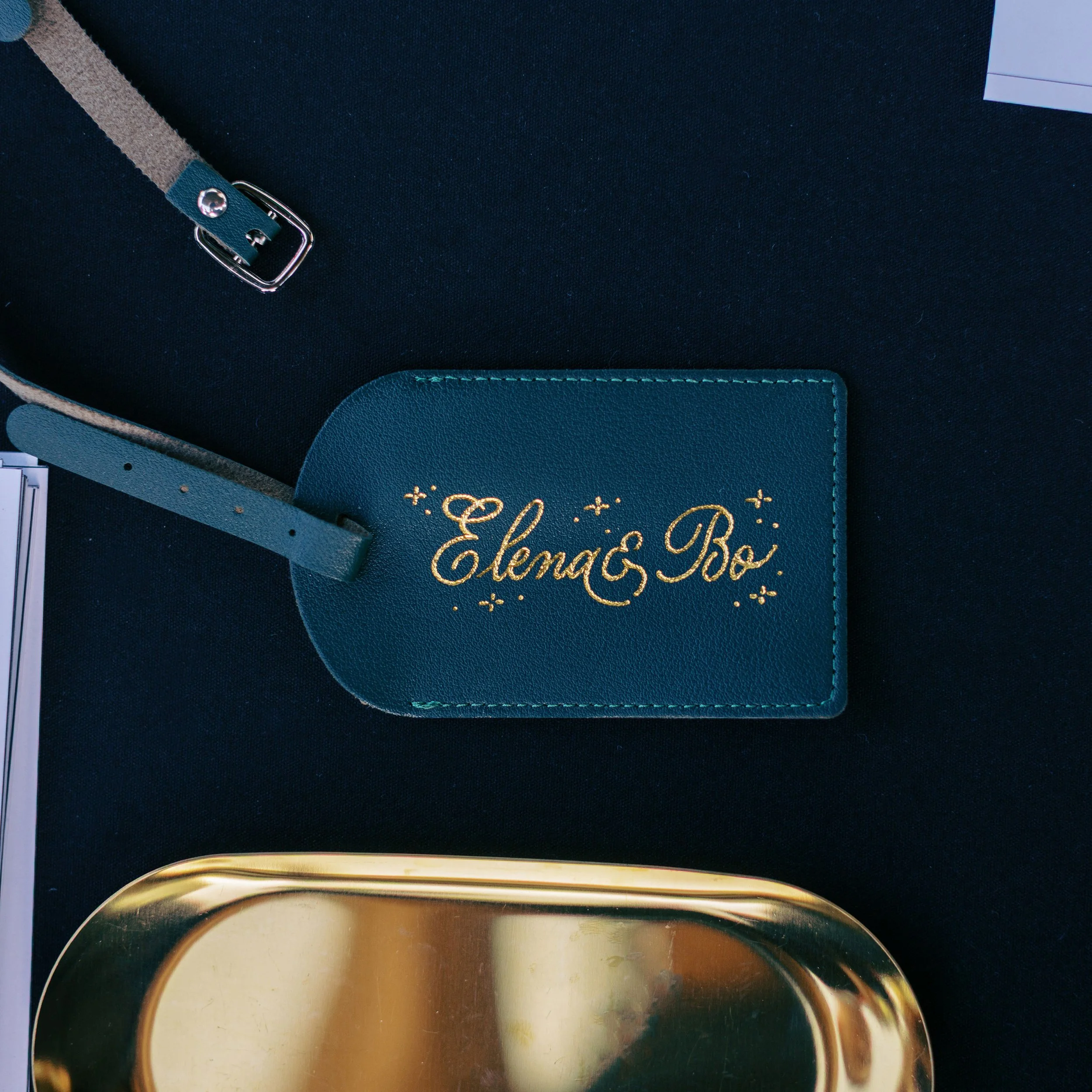 Hand foiled luggage tag for wedding Photo credit: @westypeckphotography