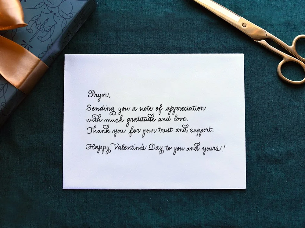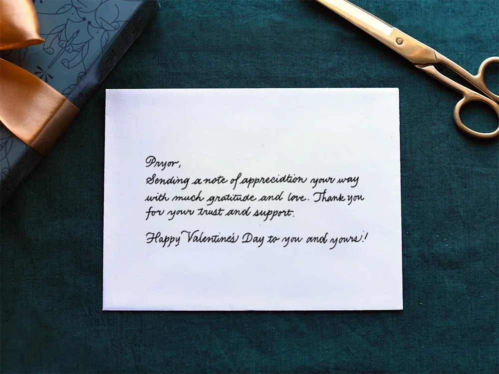 We quote thank you cards on a per-word basis and turnaround, so reach out to inquire about your upcoming penmanship needs.